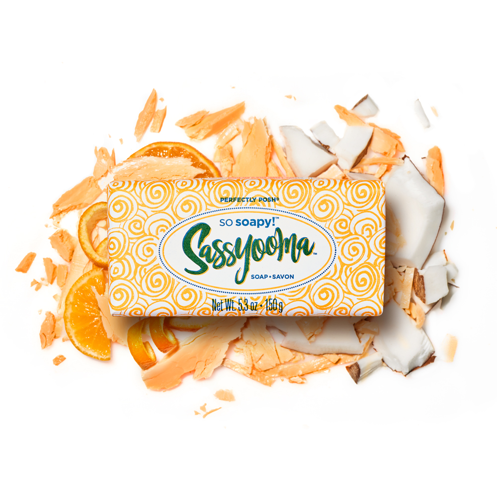 Meet Sassyooma So Soapy™, our ridiculously luxurious soap bar with excessive, natural lather from four kinds of coconut blended with shea butter and palm oil, plus double the indulgent fragrance: a sweet orchard citrus.